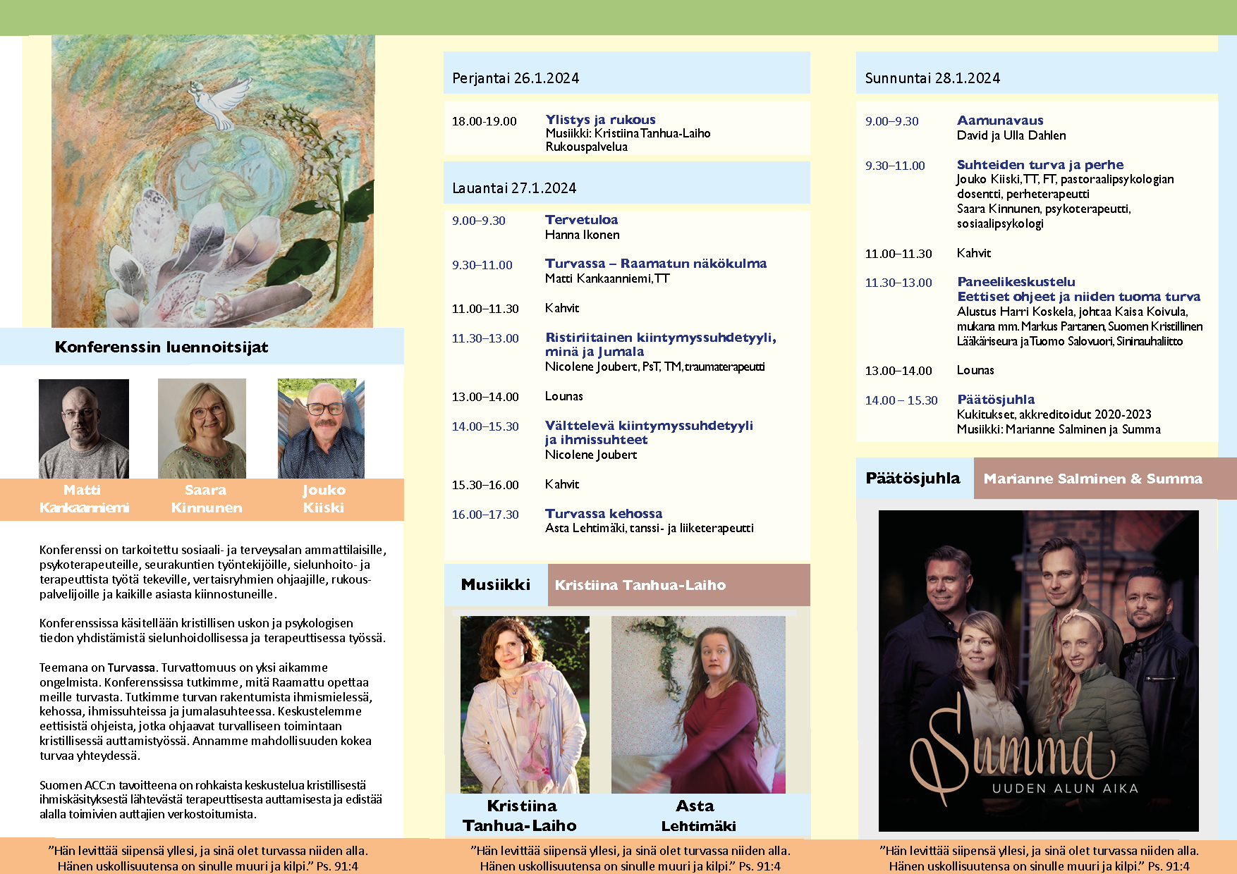 Teemana on Turvassa. Turvattomuus on yksi aikamme ongelmista. Konferenssissa tutkimme, mitä Raamattu opettaa meille turvasta. Tutkimme turvan rakentumista ihmismielessä, kehossa, ihmissuhteissa ja jumalasuhteessa. Keskustelemme eettisistä ohjeista, jotka ohjaavat turvalliseen toimintaan kristillisessä auttamistyössä. Annamme mahdollisuuden kokea turvaa yhteydessä.