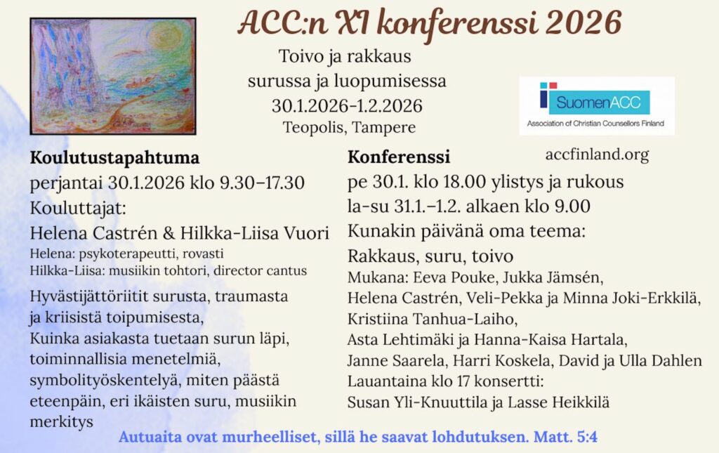 Suomen ACC:n X konferenssi- ja koulutustapahtuma 26.-28.1.2024 on pidetty Tampereella Teopoliksessa. Ohessa vielä tietoja ohjelmasta. Seuraava konferenssi ja koulutustapahtuma pidetään tammikuussa 2026.